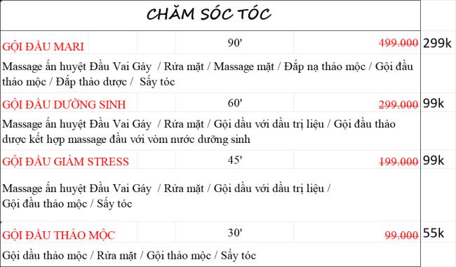 - Gội đầu dưỡng sinh:là chăm sóc tóc và da đầu một cách đặc biệt, kết hợp với việc massage vùng đầu, vai gáy, cổ, lưng,…làm sạch da đầu và tóc với các dầu gội thảo dược từ thiên nhiên như sả, bồ kết, vỏ bưởi, quế,…